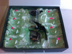 玻璃茶具泡茶,茶汤的鲜艳色泽,茶叶的细嫩柔软,茶叶在整个冲泡过程中的上下穿动,叶片的逐渐舒展等,可以一览无余,可说是一种动态的艺术欣赏。特别是冲泡各类名茶,茶具晶莹剔透,杯中轻雾缥缈,澄清碧绿,芽叶朵朵,亭亭玉立,观之赏心悦目,别有风趣。而且玻璃杯价廉物美,深受广大消费者的欢迎。玻璃器具的缺点是容易破碎,比陶瓷烫手。不过也有一种经过特殊加工的钢化玻璃制品,不易破碎,通常在火车上和餐饮业中使用。